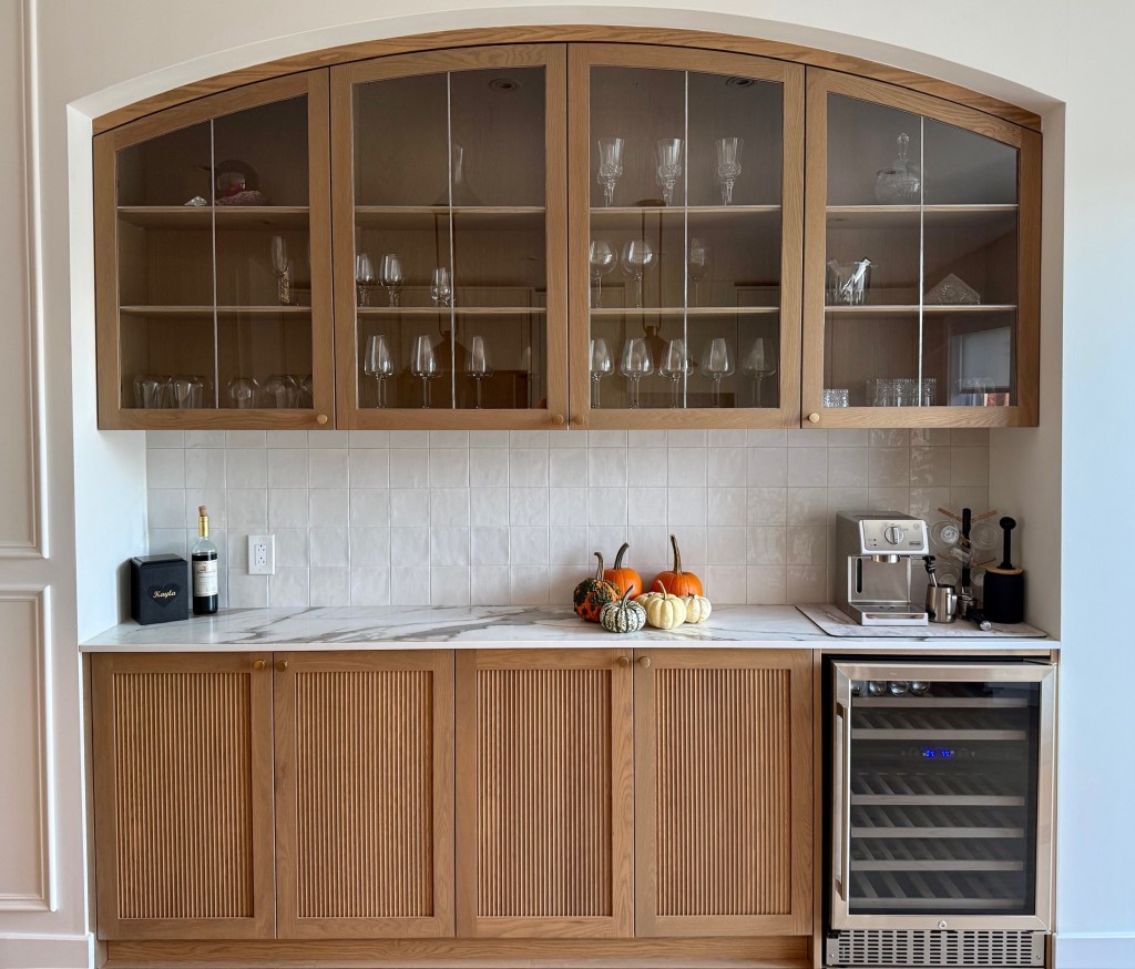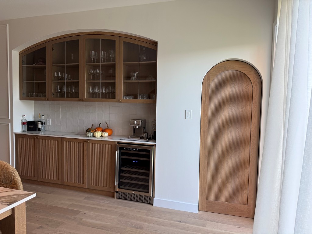 Cette réalisation illustre parfaitement l’élégance du profil perlé appliqué aux portes inférieures de l’armoire. Le relief régulier et raffiné du perlé crée une texture dynamique qui capte la lumière et ajoute de la profondeur au design. Combiné aux portes vitrées arquées dans la partie supérieure, le résultat marie tradition et modernité avec un équilibre subtil entre détails artisanaux et lignes épurées. Le ton chaleureux du bois met en valeur la finesse du veinage et souligne le caractère chaleureux de ce style de porte.